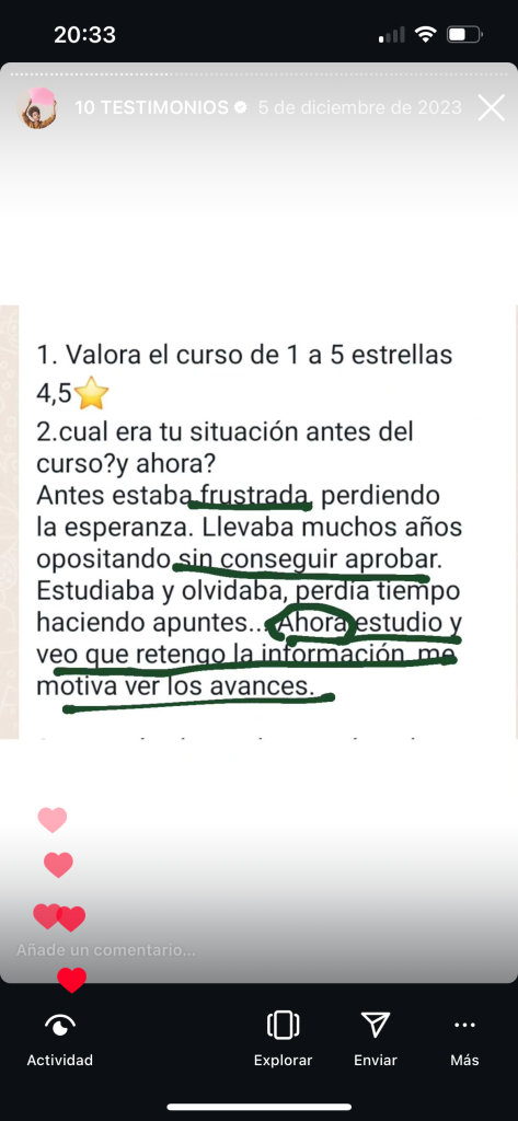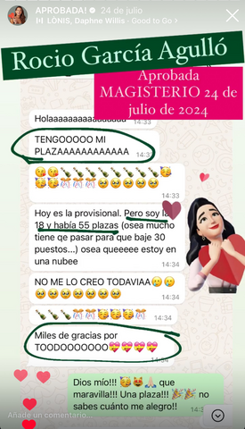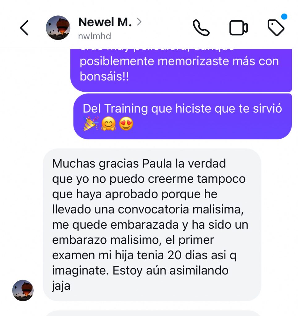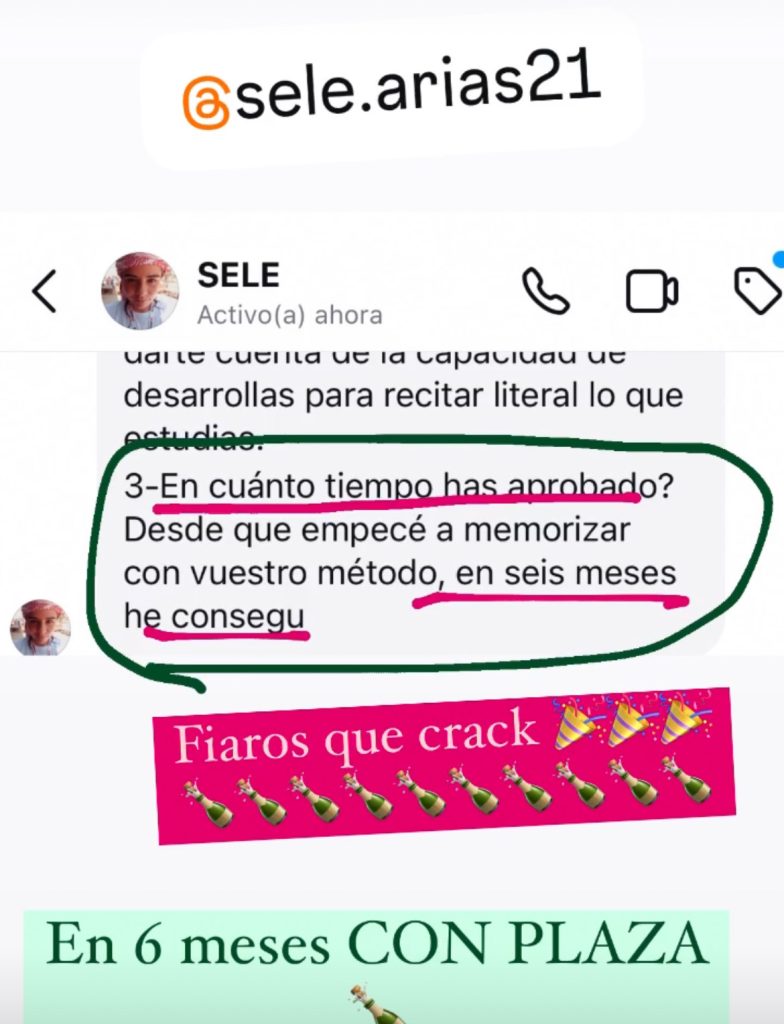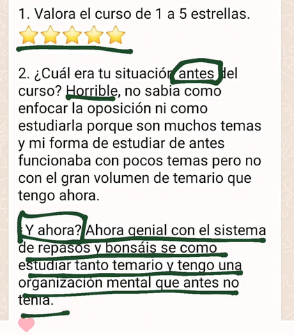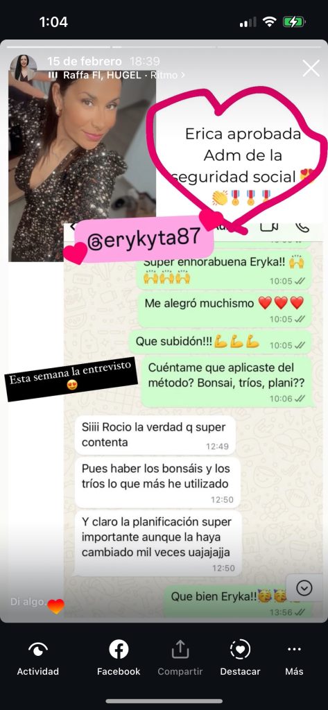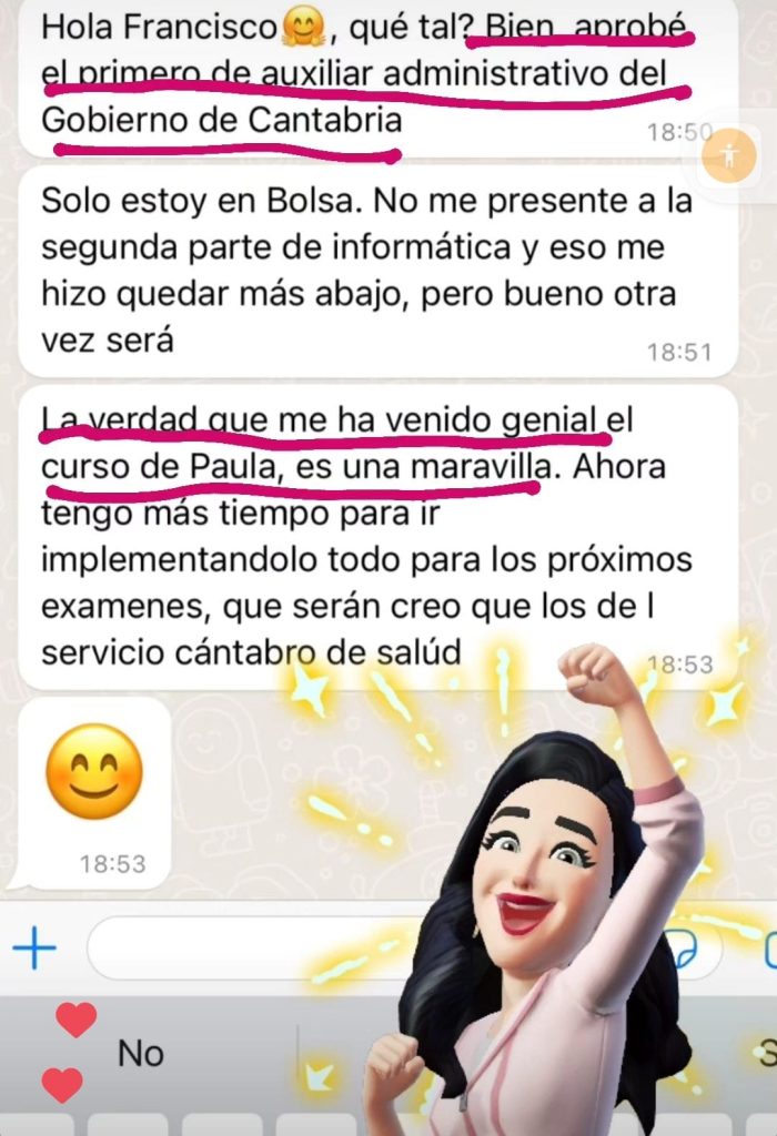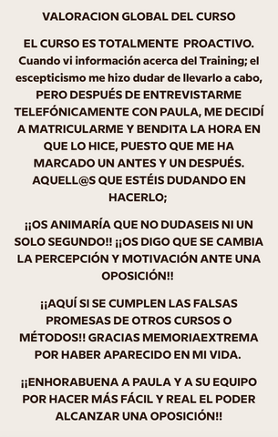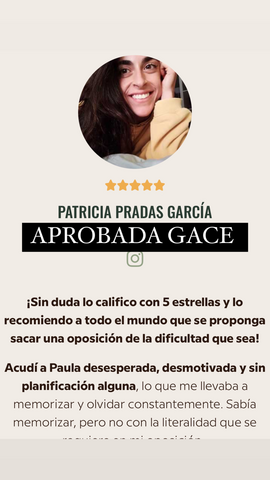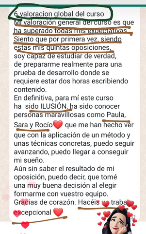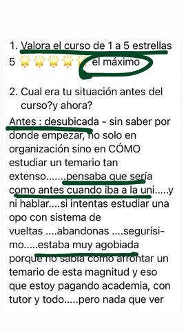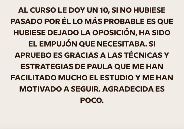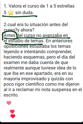 decidí apuntarme al curso porque iba a cambiar de oposición y necesitaba herramientas nuevas productivas que me acercasen a la plaza ya que yo había estado estudiando otra cosa, y el resto de opositores llevaban estudiando esa oposición 2 años, hace 1 mes y medio que me examine del examen sacando un 6,62 estudiando solo 3 meses y 2 de ellos en el curso, sin los ganchos, compactos, la planificación y la ayuda de Rocio hubiera sido imposible, ahora mismo no se si tengo plaza así que continúo estudiando ya que es un proceso de estabilización en el que la nota de examen cuenta un 55% y un 45% los méritos. Después de hacer el curso ya estudio memorizando, voy mucho más rapido y sellando bien todos los temas, ahora si me siento segura de poder decir que voy a tener una plaza
