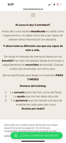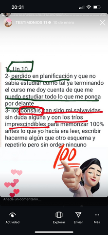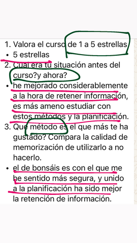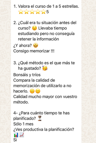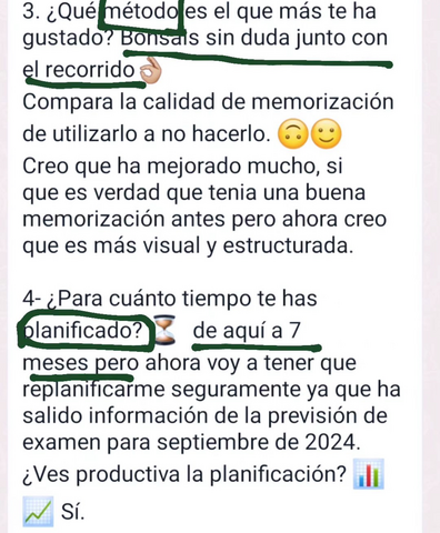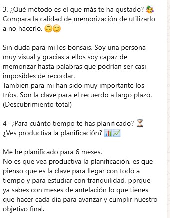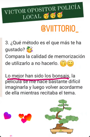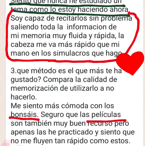 Yo soy de ciencias, mente cuadriculada, entonces el método que Prefiero los bonsáis, porque soy mucho más visual y me facilita localizar la información (esto estaba aquí abajo a la derecha…😂😂). He notado mucha mejora en la memoria, para mí ha sido un descubrimiento superar ese miedo a que si repaso en una semana ya se me va a haber olvidado todo 😊😊