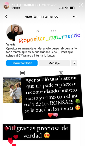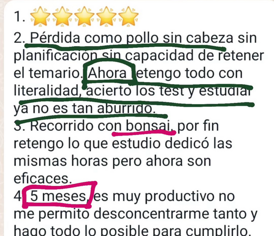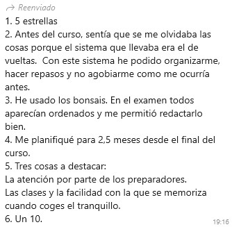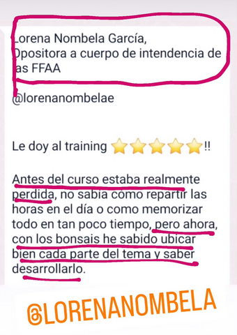 Creo que si hubiera aplicado este método a la primera oposición, la habría aprobado. Me costó coger el ritmo de estudio en ella porque acabé la carrera hace 25 años, y además tenía que superar el cansancio del trabajo para ponerte a estudiar. Ahora no me cuesta tanto porque con el método bonsáis es entretenido, y además anima mucho ver cómo reduces el temario en volumen.