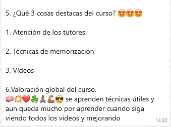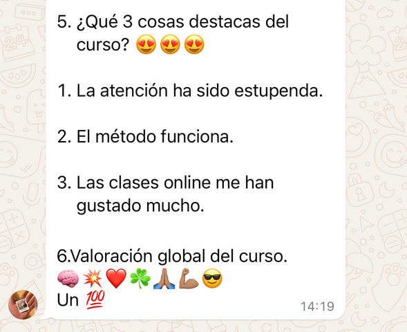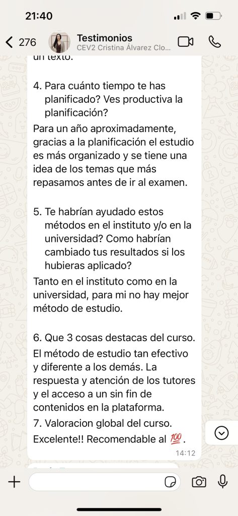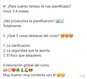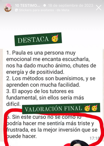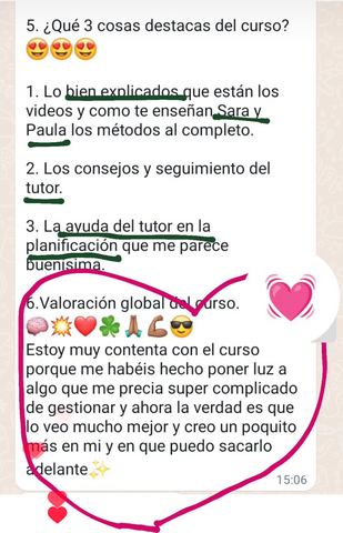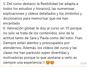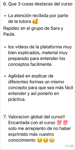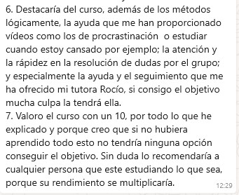 Lo que más destaco, Aparte del método en sí, la atención constante y como siempre están dispuestas a ayudarte Paula, Sara y el tutor, en mi caso Rocío, aunque no lo haya podido aprovechar al 100%. Probablemente cuando tenga un mayor volumen de temario contrate algún tiempo adicional para pulir lo que ahora no he podido