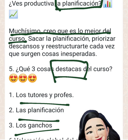 Los ganchos junto a los compactos y repasos, ver todas esos símbolos en mi cabeza, el aprender a memorizar pero de verdad y comprobando que pasa el tiempo y te lo sigues sabien y por supuesto la ayuda de Rocio y Sara, siendo súper cercanas, estando pendiente y respondiendo en todo momento a las dudas que tenía. ❤️❤️