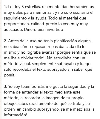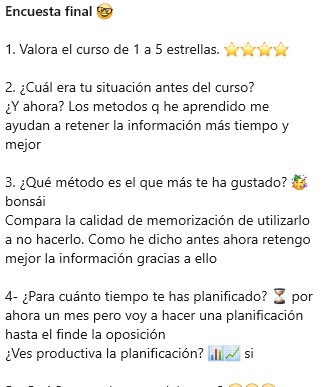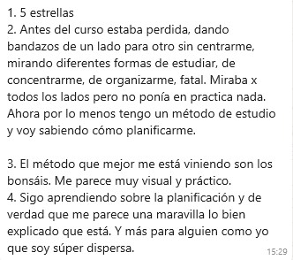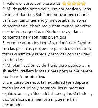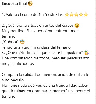 Para mi el curso ha sido un reseteo muy positivo a nivel de métodos de memorización, te enseña todo lo que necesitas saber para ser productivo a largo plazo y por su puesto en tu día a día.