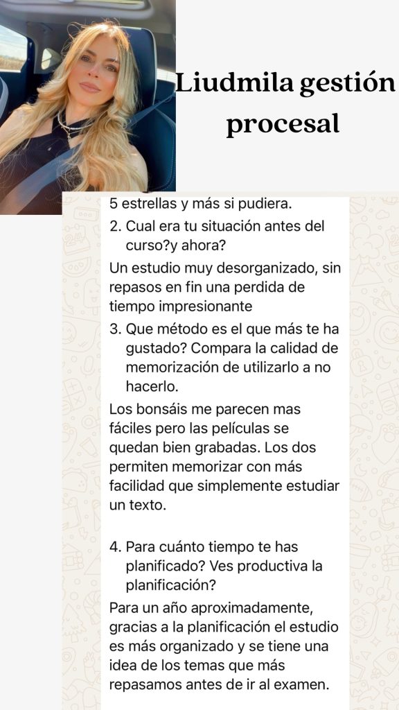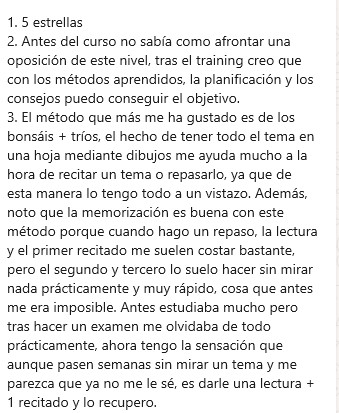 –Antes del curso me costaba mucho estudiar, y memorizar era una tarea que me consumía, no tenía planificado nada, iba sin pasos a seguir ni forma de abordar una oposición de gran formato (140 temas)